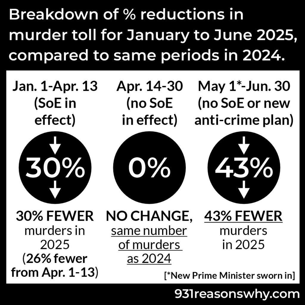 The combined total of murders for May and June was the lowest two-month total of any two consecutive months since the crime-reducing effects of the COVID-19 pandemic back in 2020-2021. Almost miraculously, there were only 59 murders altogether, compared to 104 in May-June 2024, a 43% drop. 59 dead in 61 days, less than one per day. Does this mean that the election result brought about a greater reduction in murders than the SoE did? Why would this be the case, if that's what happened?